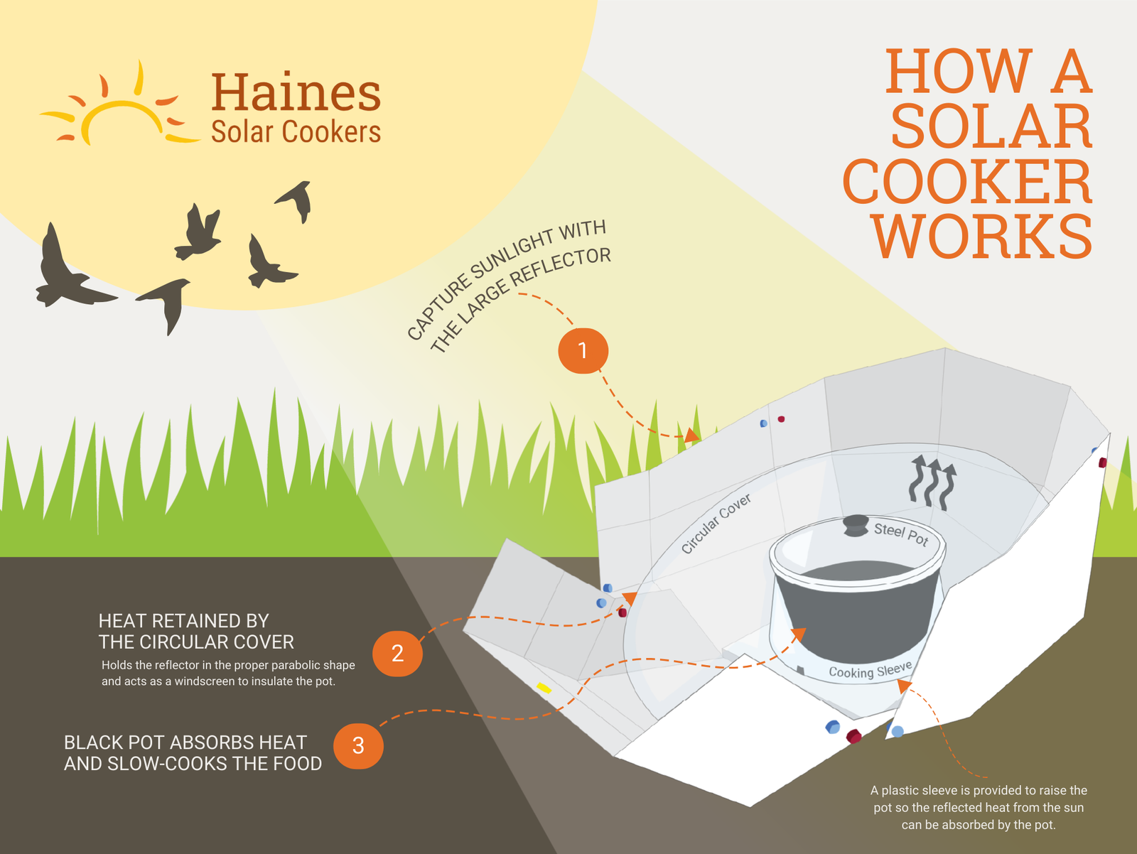 Founded in 2012, Haines Solar Cookers, LLC is committed to encouraging solar cooking in order to reduce reliance on fossil fuels and help save the environment. Profits from U.S. sales are used to promote solar cooking projects around the world. Over two billion people still cook over open fires, and solar cookers play an important role in reducing deforestation, and illnesses and injuries associated with smoky cooking fires.